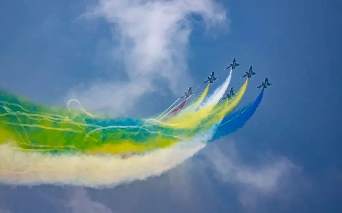 国庆假期的第一天,珠海金湾机场的上空,除了一望无际的蓝天白云,还有飞行表演队留下的五彩烟带。
