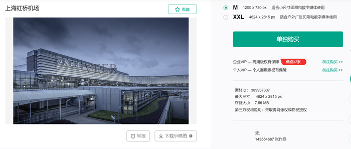 据VEER官方网站介绍,该公司为视觉中国子公司,是一家国际化的微图提供商,为客户在线提供优质图像资料。红星新闻记者在该网站检索张立所拍摄的“上海虹桥机场”图片发现,该图片分为“M”和“XXL”两个尺寸,其中“M”适合小尺寸印刷和数字媒体使用,“XXL”适合户外广告印刷和数字媒体使用,但是这两款尺寸图片的单独购买价格均为180元。