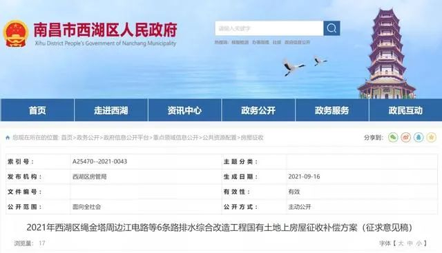 近日,南昌市西湖区人民政府发布了《2021年西湖区绳金塔周边江电路等6条路排水综合改造工程国有土地上房屋征收补偿方案(征求意见稿)》。