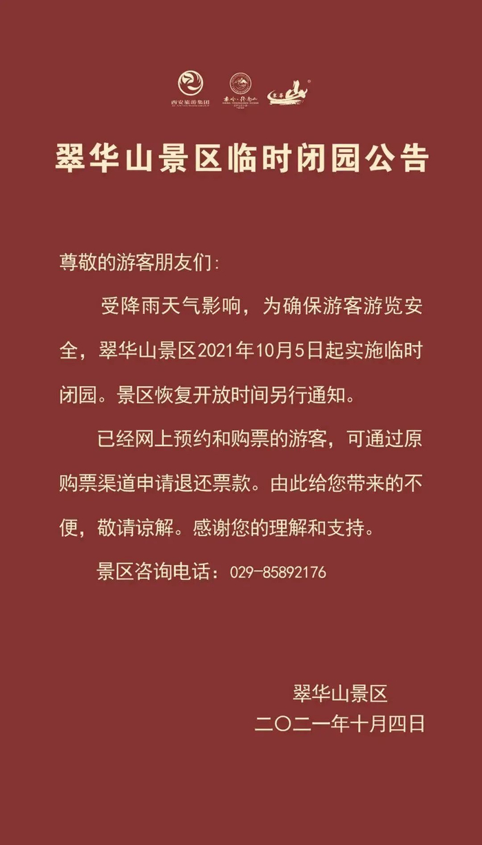 据华山风景名胜区消息,按照防汛工作要求,为确保安全,经研究,决定自2021年10月4日18时起,华山景区封山闭园 。