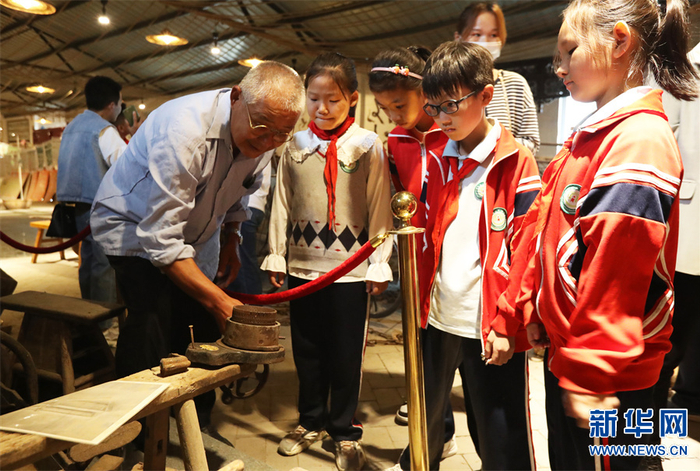 10月4日,河南许昌,鄢陵县人民路小学的学生在家长的带领下,来到“忆苦思甜”博物馆参观,近距离感受传统农耕文化。