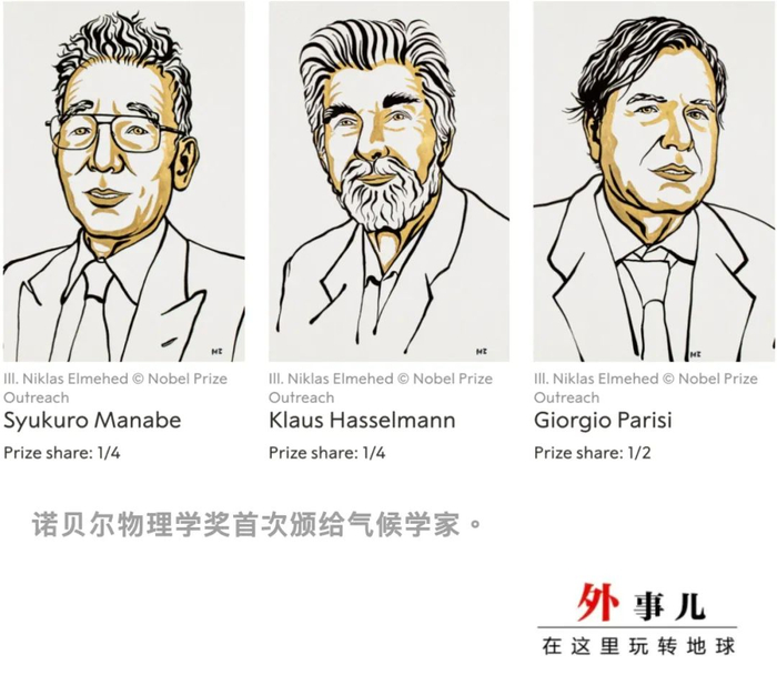 5日揭晓的诺贝尔物理学奖中,美国日裔科学家真锅淑郎和德国科学家克劳斯·哈塞尔曼共享奖项的一半,以表彰他们“对地球气候进行物理建模,量化可变性,并可靠地预测了全球变暖”;意大利科学家乔治·帕里西(Giorgio Parisi)则因其“在从原子到行星尺度的物理系统中无序和波动的相互作用方面的发现”获得另一半物理学奖。
