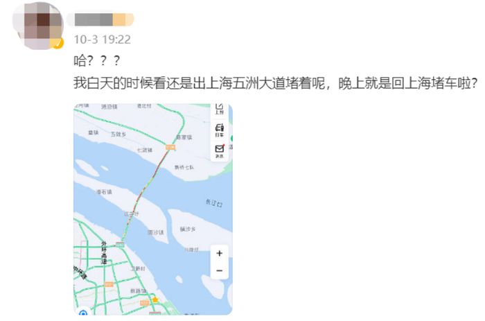 至今天上午9时,除上述路段依然保持缓行状态外,陈海收费站入口前已有600米缓行路段、崇启大桥上有1公里路段也已缓行。