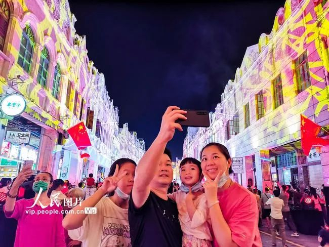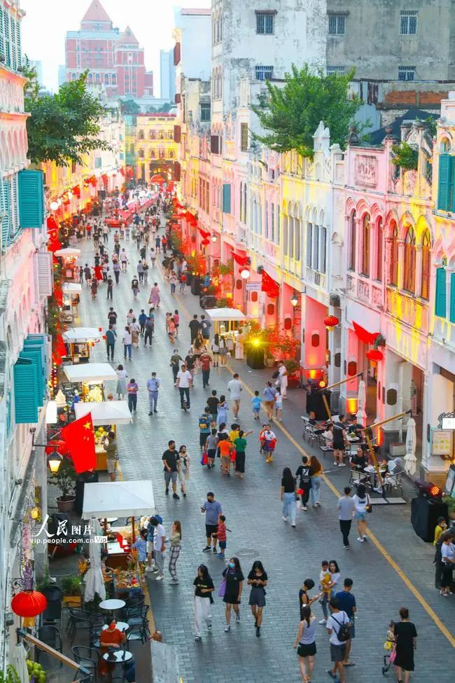 △市民游客在骑楼老街游景区、赏美景、看演艺、品美食,街道上处处红旗飘扬,很是热闹。