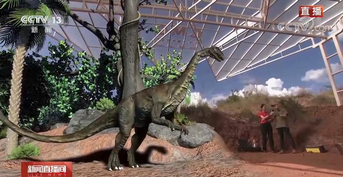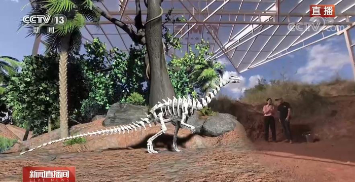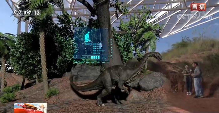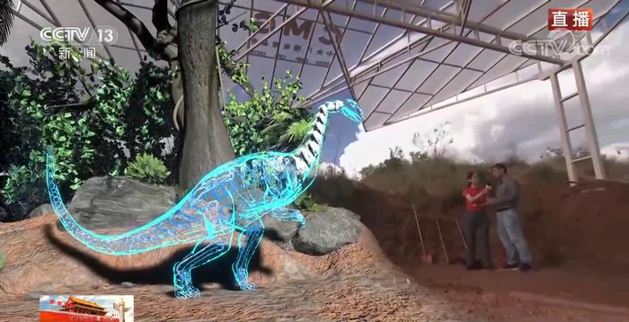 为了能够更好地呈现科学发现的细节,也为了让您更能身临其境感受侏罗纪世界,我们在前方也特别搭建了沉浸式混合现实系统,在科考现场就能实时看到根据骨骼化石复原的恐龙模样,实现野外互动直播。一眼穿越亿万年。