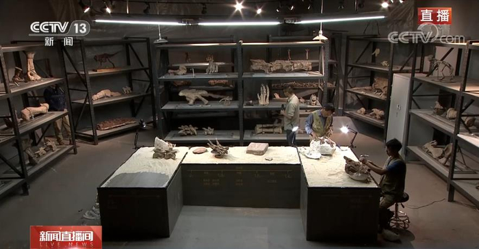目前2号科考现场的恐龙化石骨架,整体面貌已经显现,那之前出土的1号科考现场的恐龙化石修复工作进行到哪一阶段了?来连线正在恐龙化石修复中心的总台央视记者张艺瑾。