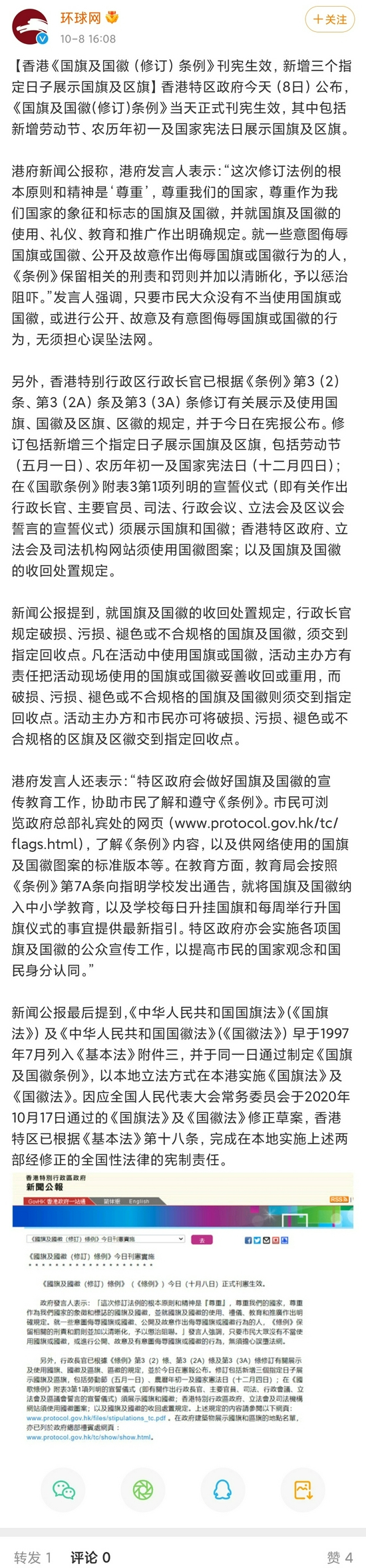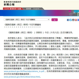 另外,香港特别行政区行政长官已根据《条例》第3(2)条、第3(2A)条及第3(3A)条修订有关展示及使用国旗、国徽及区旗、区徽的规定,并于今日在宪报公布。修订包括新增三个指定日子展示国旗及区旗,包括劳动节(五月一日)、农历年初一及国家宪法日(十二月四日);在《国歌条例》附表3第1项列明的宣誓仪式(即有关作出行政长官、主要官员、司法、行政会议、立法会及区议会誓言的宣誓仪式)须展示国旗和国徽;香港特区政府、立法会及司法机构网站须使用国徽图案;以及国旗及国徽的收回处置规定。