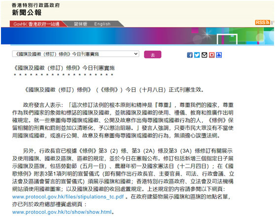 新闻公报最后提到,《中华人民共和国国旗法》(《国旗法》)及《中华人民共和国国徽法》(《国徽法》)早于1997年7月列入《基本法》附件三,并于同一日通过制定《国旗及国徽条例》,以本地立法方式在本港实施《国旗法》及《国徽法》。因应全国人民代表大会常务委员会于2020年10月17日通过的《国旗法》及《国徽法》修正草案,香港特区已根据《基本法》第十八条,完成在本地实施上述两部经修正的全国性法律的宪制责任。