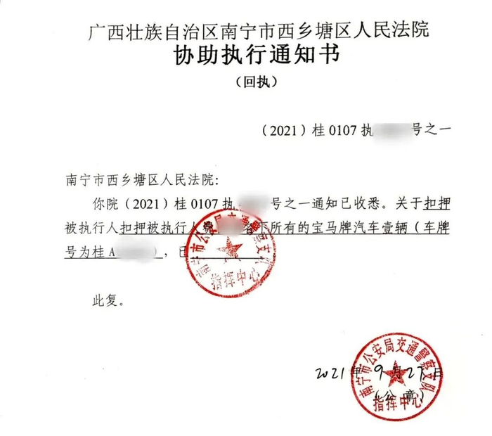 9月27日,西乡塘区法院执行局与南宁市公安局交警支队联手出击、通力合作,从布控车辆到扣押车辆,仅用不到半天的时间,就将被执行人名下的一辆宝马实施扣押。该起执行行动捍卫了法律的尊严和权威。