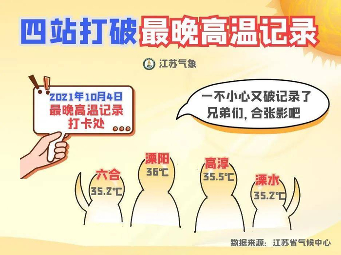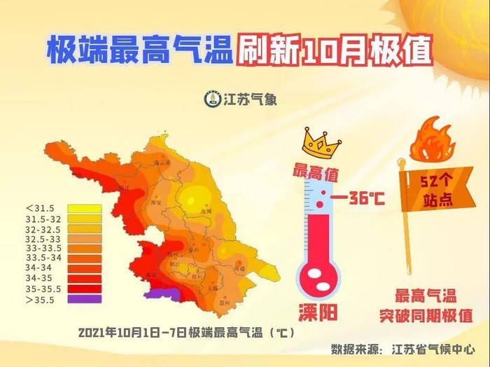 根据江苏省气候中心统计,受副热带高压控制,今年国庆假期江苏省平均气温25.2℃,较常年同期偏高5.9℃,为历史同期最高值。国庆期间江苏最高气温值达到了36.0℃(溧阳),为有观测记录以来10月历史同期极端最高气温。52个站点日最高气温突破10月历史同期极值。10月4日有四站出现高温天气,打破了本站高温最晚纪录。