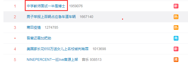 10月10日早间,教师热再度引发关注,“中学教师面试一半是博士”迅速蹿升到新浪微博热搜第一。