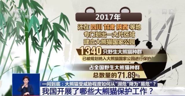 2017年,还在四川、甘肃、陕西等地专门划出一大片区域,建立大熊猫国家公园。1340只野生大熊猫种群已被规划纳入大熊猫国家公园进行保护,占全国野生大熊猫种群总数量的71.89%。