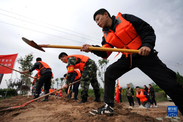 10月10日,在山西省河津市阳村街道连伯村,抢险人员在加固临时堤坝。新华社记者 詹彦 摄