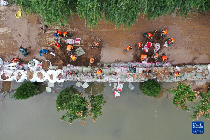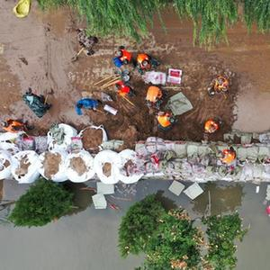 在山西省河津市阳村街道连伯村,抢险人员在加固临时堤坝(10月10日摄,无人机照片)。
