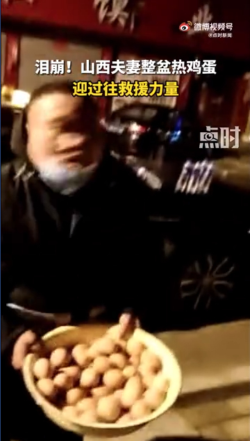 一对夫妻端着一盆煮熟的热鸡蛋塞给队员