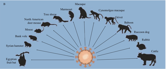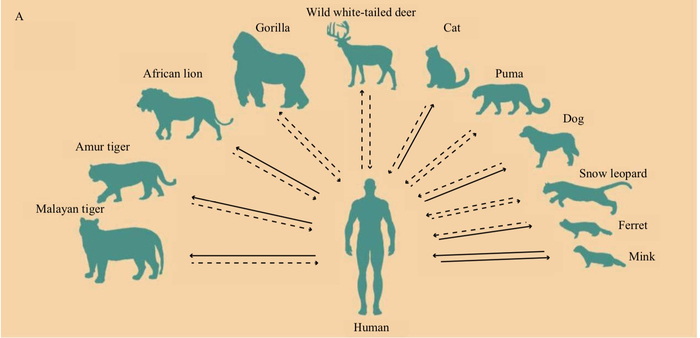 高福等人在最新的文章中写道,除人类外,还发现了其他几种哺乳动物通过与COVID-19患者接触而自然感染SARS-CoV-2,如动物园中的猫、狗、狮子和老虎、水貂和雪貂。雪豹、美洲狮和大猩猩也被发现在自然界感染了SARS-CoV-2。