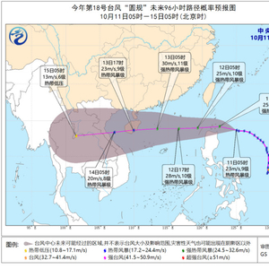 10月11日08时至12日08时,新疆西北部的部分地区有小雨或雨夹雪;云南东南部、广西西南部、海南岛、台湾岛等地部分地区有中到大雨,其中,台湾岛中东部的部分地区有暴雨或大暴雨(100~220毫米)。江南东部、华南东部等地部分地区有4~5级风。