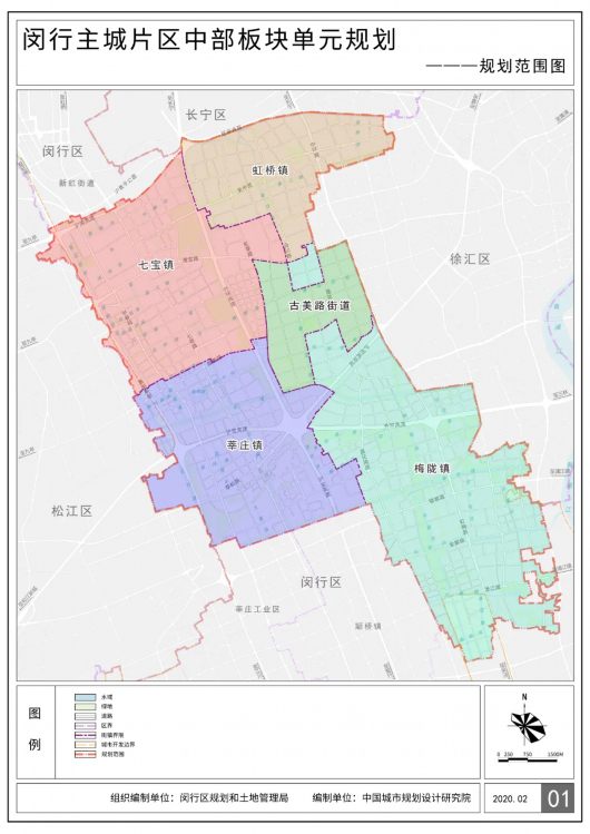 中部单元规划范围本次规划范围为上海市闵行区中部板块,北与长宁区相接,东与徐汇区相邻,西与松江区衔接,规划面积84.9平方公里,包括5个街镇,分别为七宝镇、虹桥镇、梅陇镇、莘庄镇和古美路街道。本规划期限为 2020-2035 年,其中近期2020-2025年。远期2025-2035年。