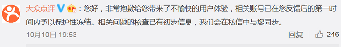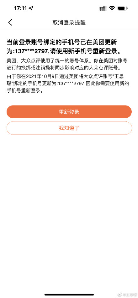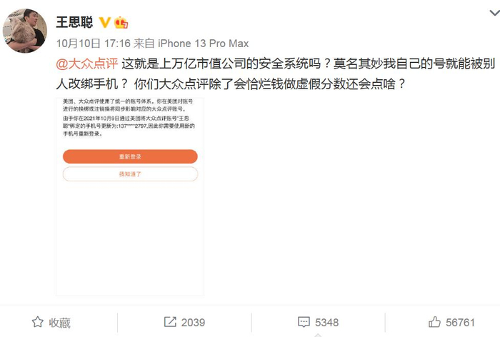 王思聪吐槽大众点评账号被改绑手机,平台:账号已保护性冻结 澎湃新闻 澎湃新闻官方账号 2021.10.1111:00 关注 原标题:王思聪吐槽大众点评账号被改绑手机,平台:账号已保护性冻结10月10日,王思聪微博发文称,自己的大众点评被别人改绑手机号。王思聪同时@大众点评,并质问道:“这就是上万亿市值公司的安全系统吗?” 王思聪微博发布页面提示:由于你在2021年10月9日通过美团将大众点评账号“王思聪”绑定的手机号更新为:137****2797,因此你需要使用新手机号重新登录。 王思聪微博发布页面提示:由于你在2021年10月9日通过美团将大众点评账号“王思聪”绑定的手机号更新为:137****2797,因此你需要使用新手机号重新登录。 10日晚间,大众点评在王思聪发文微博评论回应称:“您好,非常抱歉给您带来了不愉快的用户体验,相关账号已在反馈后的第一时间内予以保护性冻结。相关问题的核查已有初步信息,我们会在私信中与您同步。” 加载中... 视频 直播 美图 博客 看点 政务 搞笑 八卦 情感 旅游 佛学 众测