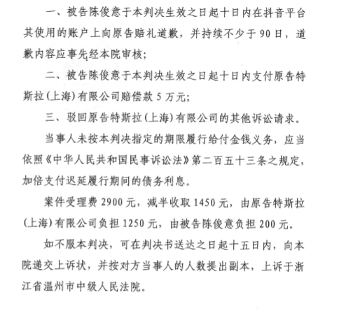 10月11日消息,红星资本局从多方获悉,特斯拉(TSLA.US)诉“812温州特斯拉失灵”车主名誉权纠纷一案有了最新进展。温州市鹿城区人民法院判决温州特斯拉车主陈某向特斯拉赔礼道歉,并支付后者赔偿款5万元。
