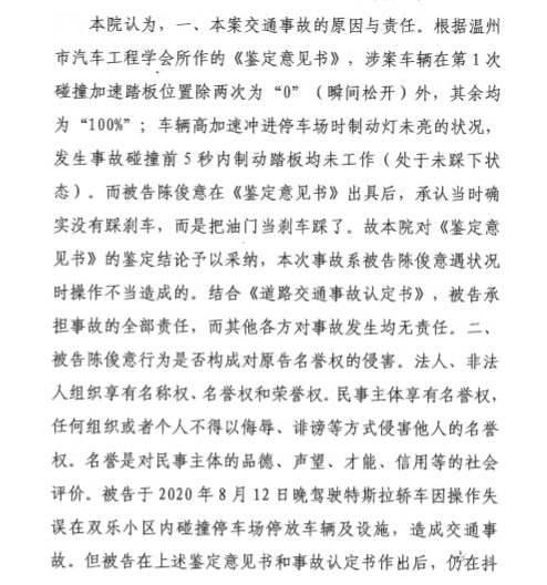 温州市鹿城区人民法院于今年6月9日受理此案并公开开庭审理。法院判决书显示,2021年5月,温州市汽车工程学会下属司法鉴定机构详细介绍了检测过程并公布调查结果:2020年8月12日发生的高速冲撞停车场并导致连环撞车事件系车主踩错踏板,即把油门踏板当成刹车踏板。