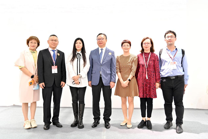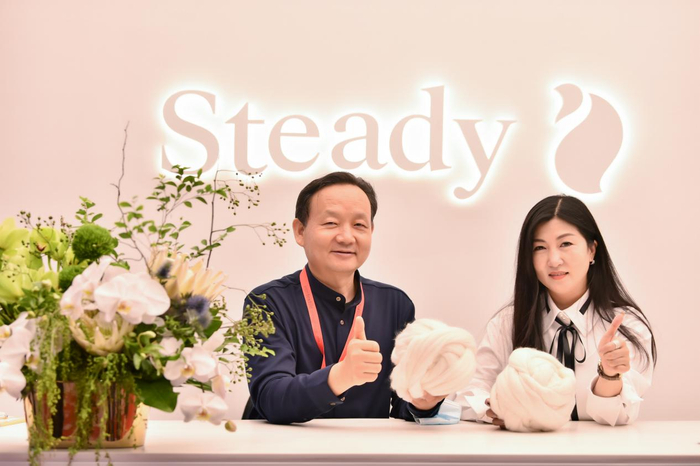 广东溢达纺织有限公司Forest Range牧场代表田总(左)/ 三德纺织市场营销总监江总(右) 在三德纺织展位,中国纺织工业联合会会长孙瑞哲一行莅临现场,孙会长对可机洗纯羊毛面料和植物染色等特色产品进行了询问解,他强调,企业要将自身资源整合好,纺织服装虽然是体验式消费,但只要你的产品功能性丰富、舒适感强,就很容易和消费者产生联系,更好地在线上进行销售推广。像这样,把一个故事从牧场讲起,就是一种尝试。
