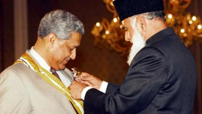 1999年,时任巴基斯坦总统的穆罕默德·拉菲克·塔拉尔为卡迪尔-汗佩戴巴基斯坦最高公民奖章 图IC