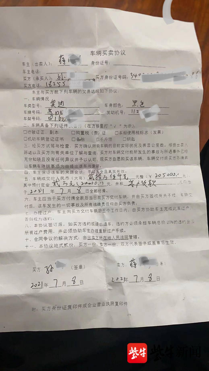 “我当时听说苏南的二手车要比安徽的二手车靠谱,所以在朋友的建议下,到常州来买的车。”孙女士告诉扬子晚报/紫牛新闻记者,今年7月,她到常州的苏南旧机动车交易市场的蕗蕗达车业、蕗蕗达精品二手车车行看中了一辆2013年的奥迪黑色Q7二手车,报价205000元。因为觉得Q7档次高,车辆看上去内外都很新,就很心动。于是,付了首付,办了贷款,就过户提车了。