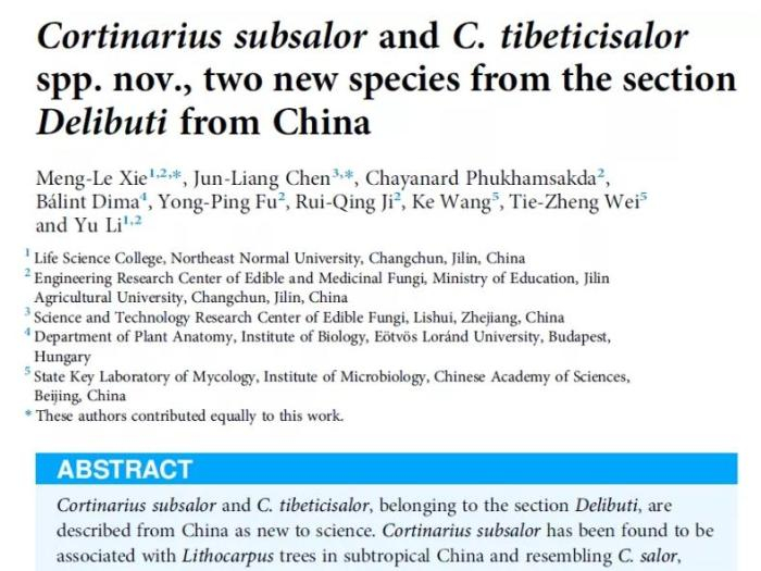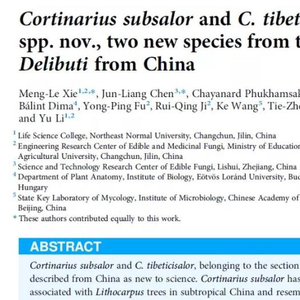 在李玉院士的指导下,采用宏观特征、显微结构等传统分类学研究方法,取子实体组织提取DNA,进行基因扩增和测序,基于ITS进行系统学分析,分子系统学分析结果表明,该物种独立为一个支系,确定为全球新物种,该新种定名为近蓝紫丝膜菌。