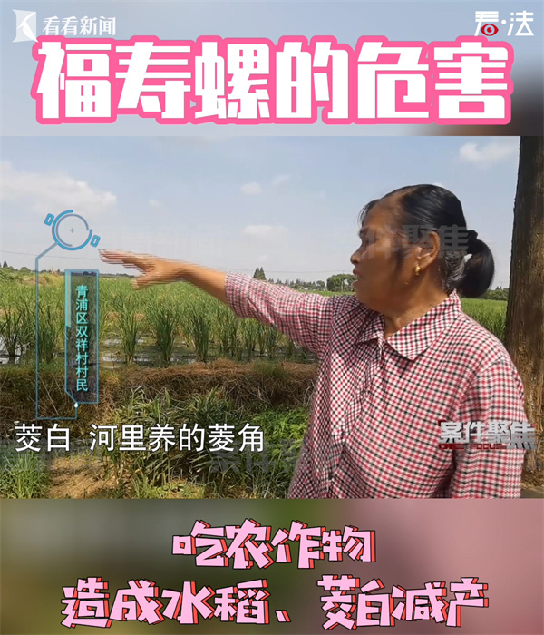 这种外来入侵物种就是福寿螺,原生长在南美洲,以前因被视为高蛋白食物于1981年引入国内养殖。然而人们很快发现,福寿螺在中国没有天敌,而且繁殖能力强,严重破坏湿地生态系统和农业生态系统。在金泽镇双祥村一处农田旁,农民告诉检察官,福寿螺会吃种在田里的禾苗,并且会把卵直接产在禾苗的根部。