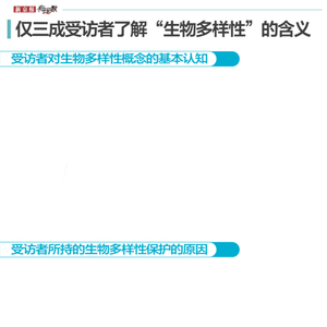 2021年5月发布的一项针对国内3000名公众的《中国公众生物多样性认知调查报告》显示,91%的受访者听说过“生物多样性”一词,但大部分受访者对生物多样性概念模糊,仅有34%的公众表示知道其含义。
