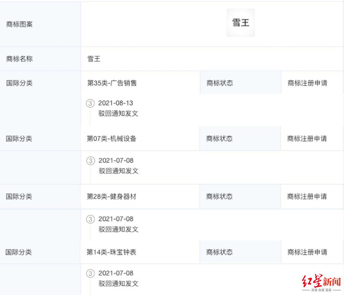 2020年3月25日,蜜雪冰城申请第32类商标“雪王”,后被国家知识产权局驳回申请,随后蜜雪冰城申请驳回复审。2021年1月28日,国家知识产权局再次驳回复审。