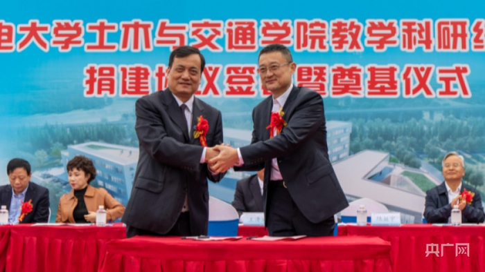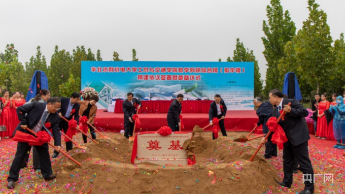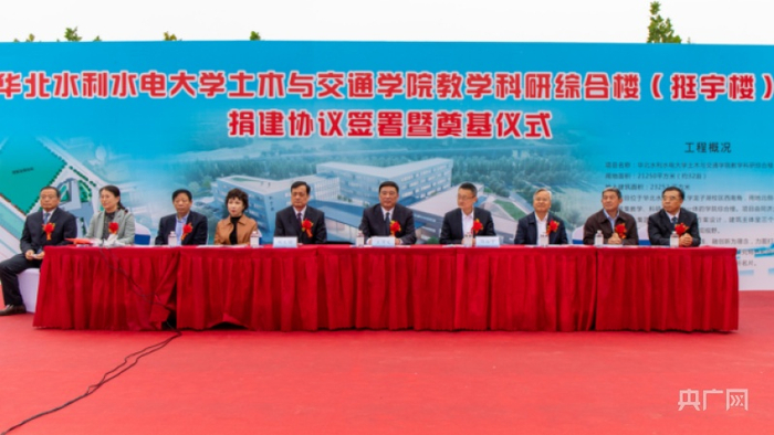 央广网郑州10月15日消息(记者 夏莎)10月15日上午,虽然天空飘着小雨,却浇不熄华北水利水电大学师生们的热情。大家喜气洋洋,相聚在学校龙子湖校区西南角,共同见证土木与交通学院教学科研综合楼暨“挺宇楼”捐建协议签署暨奠基仪式。