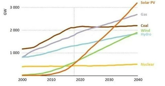 国际能源署对2000-2040年全球太阳能(橙线)、天然气(紫线)、煤炭(棕线)、风力(绿色)、水力(蓝色)和核能(黄色)发电量的预测。