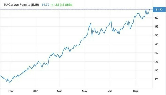 ● 欧洲今年再生能源供应量不足,核能发电的趋势也递减,导致煤炭发电量的复苏。而煤炭发电量增加了二氧化碳的排放,导致欧洲碳价暴涨,增加了煤炭发电的成本,甚至已经超过了天然气发电的成本。这样很多煤炭发电退出了市场,电力市场的供应量进一步下降,电价飞涨,碳价飞涨,并恶性循环。过去十年左右的时间里,欧洲碳价基本在30欧元以内,但今年一路上扬,甚至突破了60欧元。
