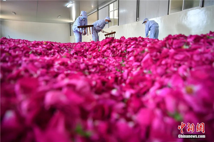 图为工作人员在加工食用玫瑰。中新社记者 刘冉阳 摄