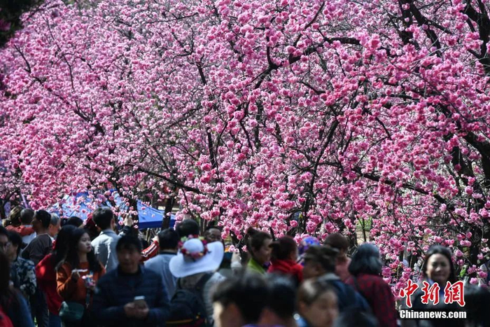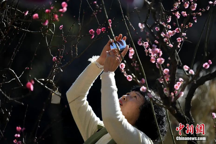 游客在昆明黑龙潭公园赏古梅、游花海。中新社记者 康平 摄