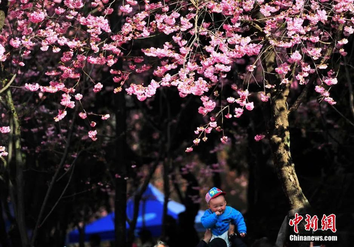云南昆明,大批民众观赏“圆通樱潮”景观。 任东 摄春风拂面