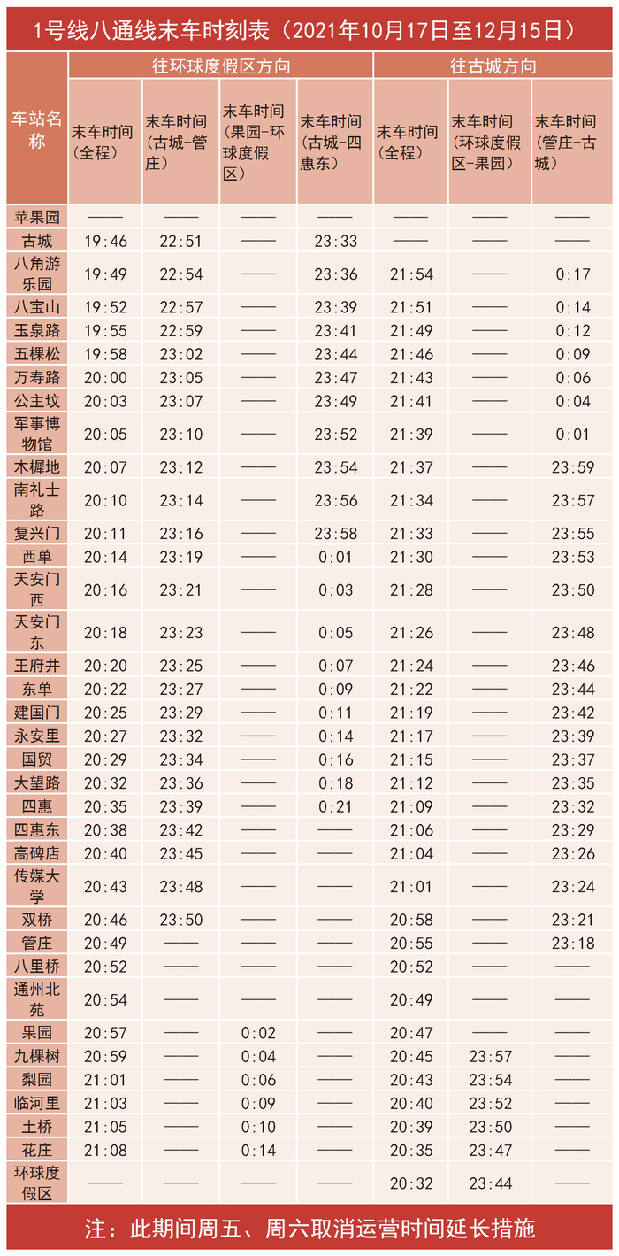 从本月至年底,因配合新线开通以及地铁沿线交通噪声治理,北京多条地铁线路、车站采取调整运营时间等措施,确保线路如期开通、噪声治理工程进展顺利。其中,今晚(15日)起至12月15日,昌平线沙河高教园至朱辛庄区段将提前结束运营;周日(17日)起至12月15日,1-八通线管庄站至果园站区段提前结束运营,古城站(开往环球度假区)全程末班车提前至19:46,环球度假区站(开往古城)全程末班车提前至20:32,其他车站全程末班车时间均将进行相应调整。