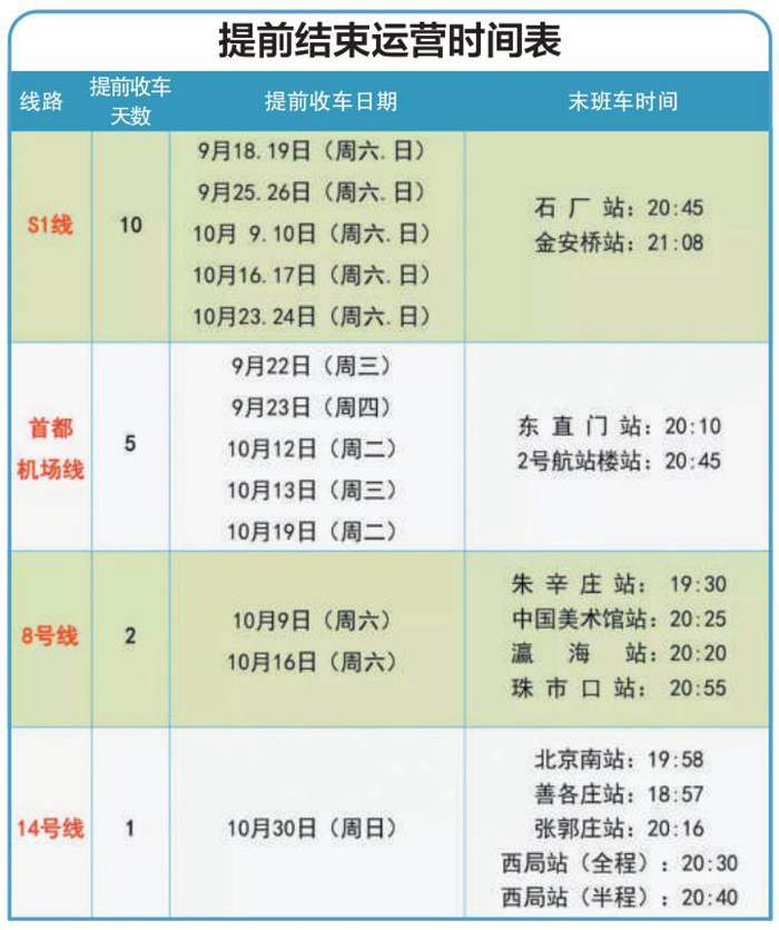早收车时段:计划于10月16日(周六)、10月17日(周日)、10月23日(周六)、10月24日(周日),提前收车。S1线石厂站末班车提前至20:45,金安桥站末班车提前至21:08。