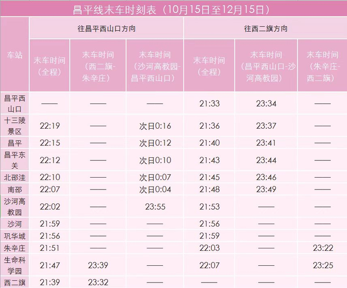 按照计划,2021年10月15日至12月15日,地铁昌平线沙河高教园至朱辛庄区段将提前结束运营。昌平线西二旗站(开往昌平西山口)全程末班车提前至21:39,昌平西山口站(开往西二旗)全程末班车提前至21:33,其他车站全程末班车时间均将进行相应调整。昌平线西二旗至朱辛庄、沙河高教园至昌平西山口两个区段分段维持运营。