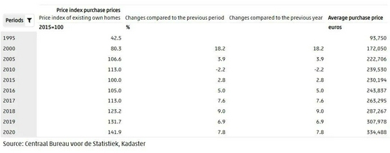 ● 荷兰房价数据统计,以2015年房价为基准,2020年房价已达到2015年房价的148% / CBS荷兰统计局