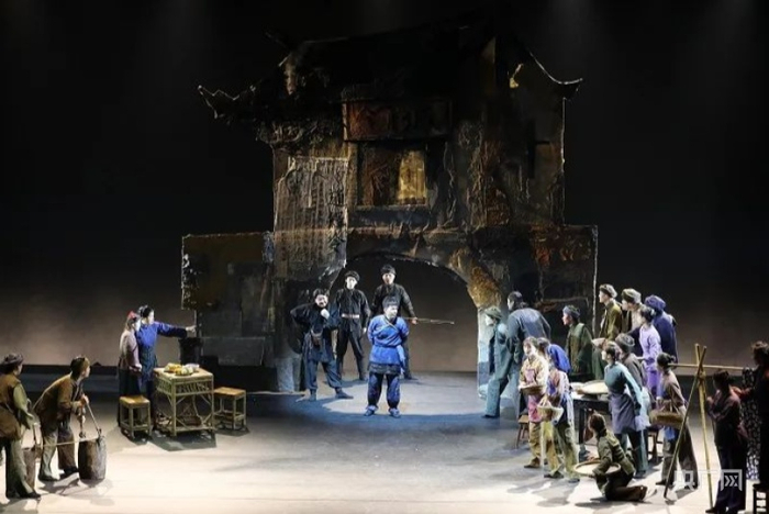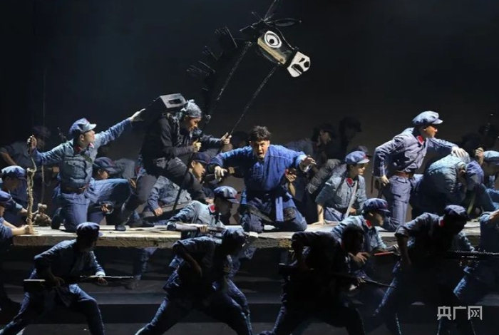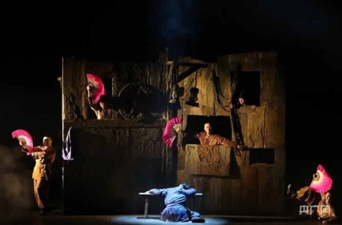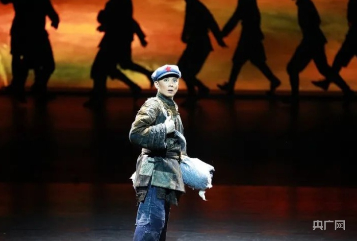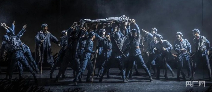 这是一个只有三景片一横板的极简空间,两块在台边,两块在空中,待命腾挪升降,幻化成杉树岩的纯净美好、大余县城的市井群像、遵义古城的紧张局势、湘江潮头的小船板荡、茫茫草地的一派死寂。现实中有时间顺序的不同空间进行假定连接,戏剧时空随演员的表演、行动的推进而灵活变换,成为自由流动的时空。