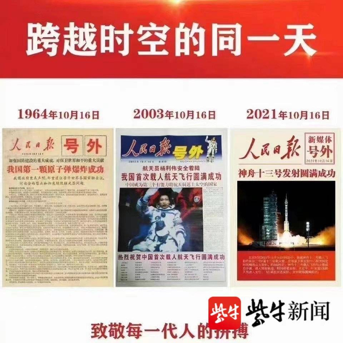 就在神舟十三号官宣发射时间后不久,有细心的网友发现,10月16日是一个标准的“好日子”,在18年前的同一天,2003年的10月16日,航天员杨利伟安全着陆,我国首次载人航天取得圆满成功。此外,10月16日还是我国第一颗原子弹爆炸成功的“时间刻度”。神舟十三号发射也要“跨越时空同一天”的说法不胫而走。