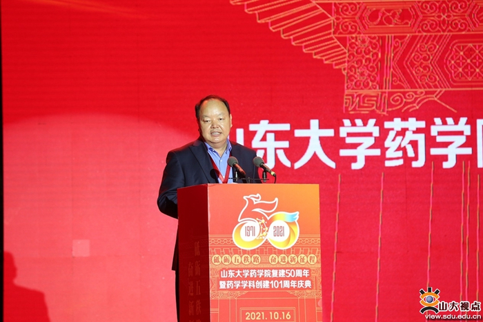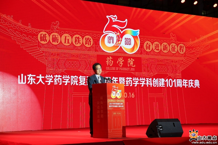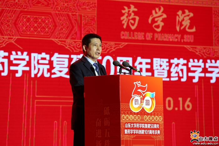[本站讯]博施济众五十载,桃李芬芳满天下。10月16日,药学院在趵突泉校区体育馆举行复建50周年暨药学学科创建101周年庆典活动。国家药监局局长邵明立,中国药科大学副校长姚文兵,中国科学院上海药物研究所副所长赵强,齐鲁医学院党工委书记刘洪渭,国际欧亚科学院院士、山东大学国家糖工程中心主任凌沛学等出席庆典。山东大学党委副书记王君松,欧亚科学院院士、中国医学科学院杜冠华教授,北京大学药学院院长周德敏,齐鲁制药集团副总裁张明会出席庆典并致辞。中国科学院上海药物研究所陈凯先院士,南澳大学、西安交通大学药学院、西南大学药学院、兰州大学药学院、暨南大学药学院等发来贺信、贺礼,表达了对药学院复建50周年院庆的热烈祝贺和对未来发展的美好祝愿。