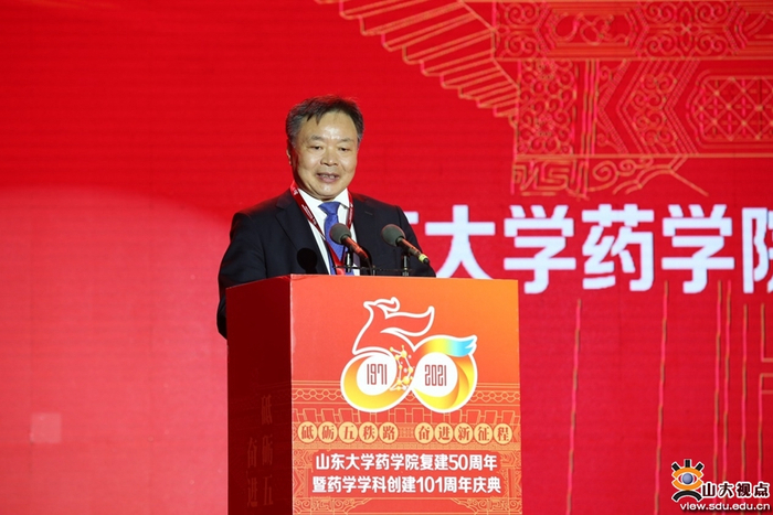 药学院院长鞠建华在致辞中谈到,山东大学药学院源自于1920年的齐鲁大学药科,复建于1971年,药学院的五秩历史是一部药学人自强不息、艰苦奋斗的创业史,也是一部与时俱进、追求卓越的改革史。他表示,站在建党百年、建校百廿的历史交汇点,广大药学师生医务员工要立足中华民族的伟大复兴,心怀“国之大者”,蓄势谋远,以建设世界一流药学院为目标,将药学院建设成为一所特色鲜明、优势明显、高度开放性和国际化的学院,为服务国家富强、民族复兴和人民幸福作出新的更大贡献。