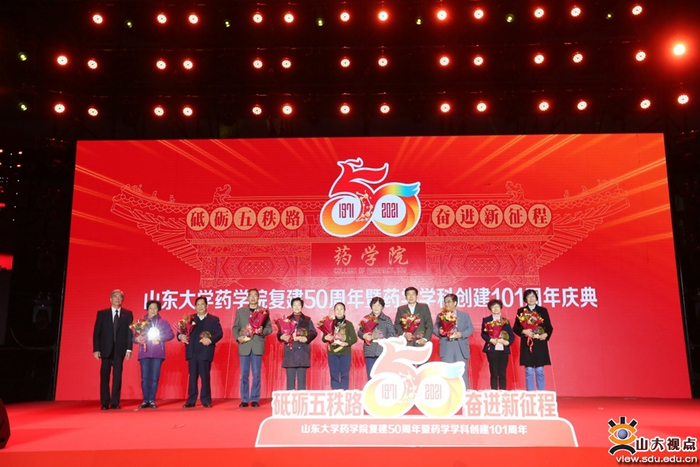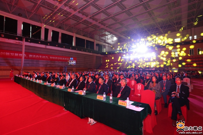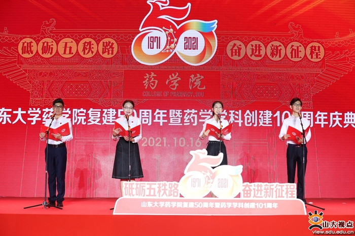 庆典由药学院党委书记王秋生主持。50家兄弟院校药学院负责人和学者代表,20余家合作单位代表,11家山东大学兄弟单位代表,山东大学药学院退休教师代表、党支部书记、民主党派负责人、师生代表、校友代表、学院党政班子全体成员以及线上5000余名师生医务员工、海内外校友参加庆典。