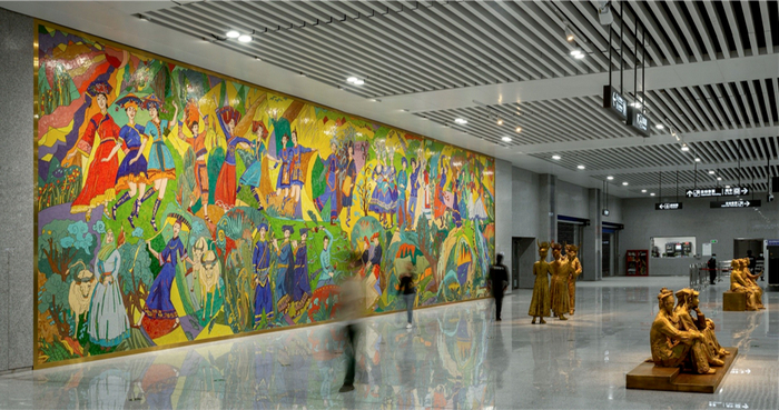 13个人物构成的雕塑作品分为三组,中心位置展现贵州苗族“拦路酒”迎宾的民族习俗;左右两组雕塑共九位优美的各民族女性,她们或喁喁细语、或恬静而坐、或眺望远方,似在静候四方来客。热烈欢快的壁画与相对静态的人物雕塑相互映衬、张弛有度,共同营造出多彩、欢快、好客的艺术场景,也使公众在高朗简约设计的站厅空间中产生律动之感,成为整个站厅的视觉中心和主题聚焦中心。