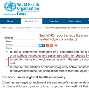 另据外媒报道,世卫组织本想在《烟草控制框架公约》 (FCTC)第九次缔约方会议上催促各国对电子烟采取和卷烟同样严厉的监管措施。但因世卫组织对烟草替代产品的立场让部分成员国担忧,讨论将无法达成共识,因此世卫组织将相关议题——“对新型烟草制品的讨论”推迟到2023年。