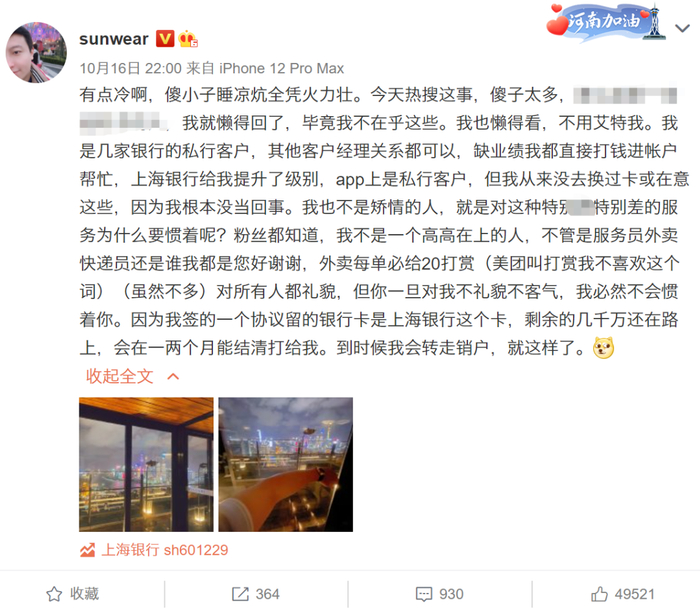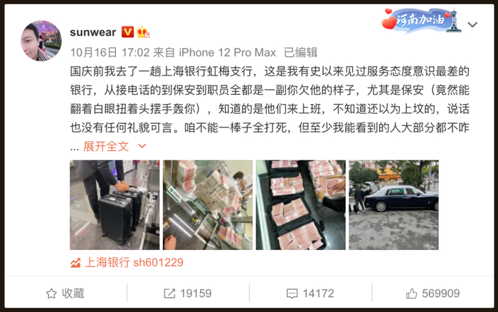 10月16日晚,认证为“信息安全、网络安全专家”,有170万粉丝的微博大V@sunwear 发文称,上海银行虹梅支行服务态度意识差,自己一怒之下从银行一口气取了500万元钞票,两名工作人员清点了2个小时。